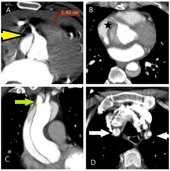 Vascular complications of aortic dissection. (A) CT image of a 52-year-old female patient who presented to the emergency department with tearing chest pain. Electrocardiography revealed findings consistent with inferior myocardial infarction, but elevated D-dimer and C-reactive protein levels prompted further evaluation with CT, leading to a diagnosis of aortic dissection. The dissection flap was found to originate from the right coronary artery ostium (yellow arrow). Additionally, 1.43 cm of pericardial effusion due to the dissection was observed. (B) CT image of a 62-year-old male patient presenting with findings of inferior myocardial infarction. Point-of-care echocardiography in the emergency department raised suspicion of an intimal flap. Further evaluation revealed that the type A aortic dissection also dissected the right coronary artery (black star). (C,D) CT images of a 65-year-old male patient on antihypertensive medication who presented to the emergency department after experiencing syncope following upper extremity numbness. The dissection was found to extend along the brachiocephalic trunk (green arrow) and carotid arteries (white arrows).