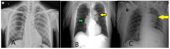 X-ray images associated with aortic diseases. (A) X-ray image of a 25-year-old male patient with Marfan syndrome, showing a long and narrow thoracic cage and downward-appearing heart. Spinal curvature is also observed. (B) X-ray image of a 62-year-old male patient showing projections in the mediastinum corresponding to the ascending aorta. The yellow arrow indicates the aortic knob, while the green arrow highlights the prominence of rightward enlargement. (C) X-ray image of a 75-year-old male patient showing a prominent aortic knob (yellow arrow). Further evaluation of these suspicious findings is recommended.