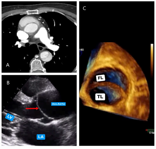 - Evangelista, A.; Sitges, M.; Jondeau, G.; Nijveldt, R.; Pepi, M.; Cuellar, H.; Pontone, G.; Bossone, E.; Groenink, M.; Dweck, M.R.; et al. Multimodality imaging in thoracic aortic diseases: A clinical consensus statement from the European Association of Cardiovascular Imaging and the European Society of Cardiology working group on aorta and peripheral vascular diseases. Eur. Heart J. Cardiovasc. Imaging 2023, 24, e65–e85. [Google Scholar] [CrossRef] [PubMed]