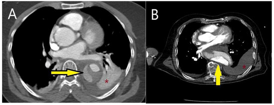 The use of CT in identifying rupture. (A) CT image of a 57-year-old female patient with a history of hypertension who presented to the emergency department with paraplegia and sudden-onset dyspnea. Hypotension prompted further evaluation with CT, which revealed a type B aortic dissection rupture into the left thoracic cavity. The yellow arrow indicates the “Yin-Yang phenomenon” within the descending aorta, suggesting continued flow in the false lumen. The patient was treated with emergency TEVAR under spinal cord pressure-reducing therapy; however, the paraplegia remained permanent. (B) CT image of an 80-year-old male patient diagnosed with type B acute aortic dissection, which led to hypotensive shock and rupture into the left thoracic cavity. * Red asterisk indicates pleural effusion.