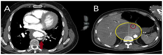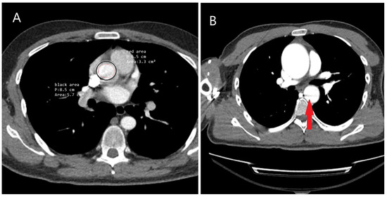 The contrast-enhanced phase is crucial, as it allows for the differentiation between the true and false lumens, identifies the rupture site, and determines the cause of obstruction in the aortic branches, whether due to flap-related or atherosclerotic/thrombotic occlusion (Figure 16A,B). The venous (late) phase aids in distinguishing flow within the false lumen from slow circulation and is useful in detecting endoleaks within stents [101] (Figure 17A,B). To minimize motion artifacts, particularly hyper-attenuation around the aortic wall, and to assess coronary arteries, it is recommended to acquire both thin-slice (<1.25 mm) and thick-slice (5 mm) images using electrocardiogram (ECG) gating [102] (Figure 18A,B).