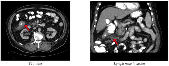 Abdominal CT scan showing T4 tumor and lymph node invasion. Arrows show T4 tumor and Lymph node invasion.