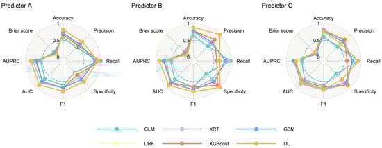 Comparisons of performances in test set for different predictors using different algorithms. AUC: area under the receiver operating characteristic curve; AUPRC: area under the precision-recall curve; DL: deep learning; DRF: distributed random forest; GBM: gradient boosting machine; GLM: generalised linear model; XGBoost: extreme gradient boosting; XRT: extremely randomised trees.