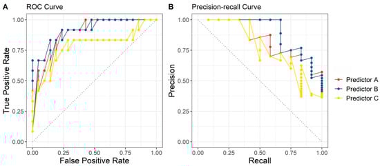 Receiver operating characteristic (ROC) curves and precision-recall (PR) curves for three set of predictors using their optimal respective machine learning algorithms. (A) ROC curve; (B) PR curve.