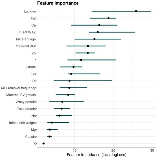 Feature importance was evaluated using the permutation approach, where the values of a given feature were randomly shuffled across the dataset while keeping other features unchanged. This process disrupts the relationship between the shuffled feature and the target variable, and the resulting increase in the prediction error quantifies the importance of that feature. Figure 4 presents the feature importance derived from Predictor B, which incorporated the greatest number of prediction variables and achieved the highest overall performance. Among milk composition variables, lactose, fat, and Ca emerged as the most influential prediction variables. In addition, infant WAZ, maternal age, and maternal BMI were identified as the most important maternal and infant characteristics.