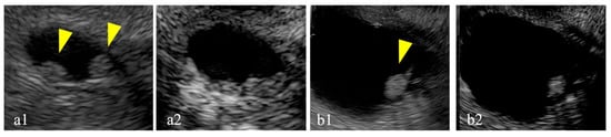 Mucus clots are difficult to differentiate from mural nodules. Case 1: a mural lesion in a cyst observed using conventional B-mode imaging (a1) exhibiting no enhancement (yellow arrow) (a2), thus leading to a diagnosis of a mucus clot. Case 2: a mural lesion in a cyst observed using conventional B-mode imaging (b1) exhibiting enhancement during imaging (yellow arrow) (b2), thus leading to a diagnosis of a mural nodule.