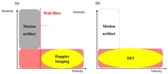 Schema of images obtained using Doppler imaging and detective flow imaging. (a) During Doppler imaging, low-velocity blood flow is not seen, and motion artifacts are observed near the wall filter. (b) Detective flow imaging uses an original algorithm to detect low-velocity vessels and reduces motion artifacts.