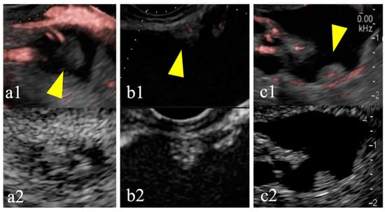 Detective flow imaging (DFI) and contrast-enhanced (CE) endoscopic ultrasonography (EUS) images of mural nodules smaller than 10 mm. Case 1 is observed using DFI-EUS (yellow arrow; a1) and CE-EUS (a2). Case 2 is observed using DFI-EUS (yellow arrow; b1) and CE-EUS (b2). Case 3 is observed using DFI-EUS (yellow arrow; c1) and CE-EUS (c2). DFI-EUS images of linear or dotted vessels inside the mural nodules. All CE-EUS images show homogeneous enhancement.