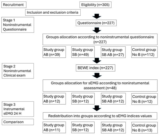 The 227 students completed the questionnaire to establish a self-reported diagnosis of bruxism—possible bruxism. Following this stage, four groups were defined: participants with awake bruxism (AB), participants with sleep bruxism (SB), participants with combined bruxism (SB AB), and participants without bruxism (No B).