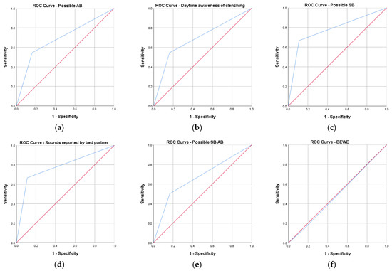 ROC curves for: (a) Possible AB; (b) Daytime awareness of clenching; (c) Possible SB; (d) Sounds reported by bed partner; (e) Possible SB AB; (f) BEWE risk; (blue line—ROC curve, red line—diagonal produced by ties).