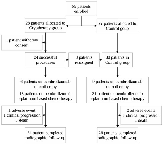 Informed consent was obtained from all subjects involved in the study. Patients were randomized in a 1:1 ratio to receive bronchoscopic cryotherapy. As per standard care, patients further received pembrolizumab monotherapy (for PD-L1 tumor proportion score equal to or greater than 50%) or pembrolizumab and platinum-based chemotherapy (for PD-L1 tumor proportion score less than 50%). Patients who were assigned to the cryotherapy group were offered to continue as controls if the procedure was not technically successful.