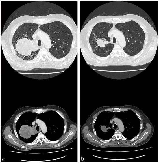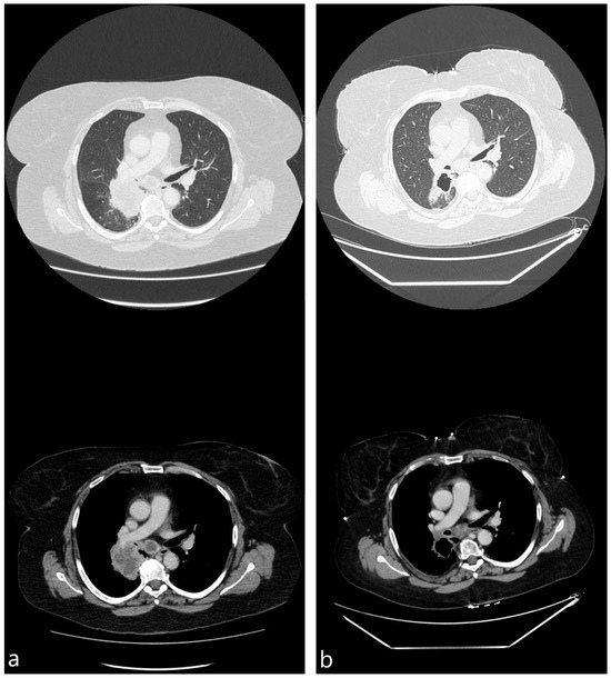 CT images, obtained almost 2 weeks before (a) and 4 weeks after (b) bronchoscopic cryotherapy (65 y.o. male with stage IV adenocarcinoma, PD-L1 expression 20%).