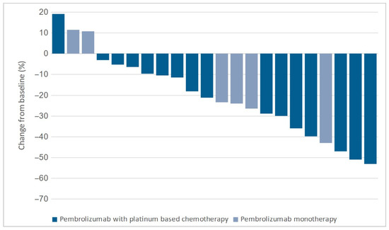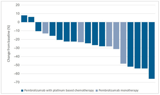 No significant difference in the median change in target lesions between the groups was observed. The median change was −24.0% (−13.8% to −44.1%) in the cryotherapy group and −23.4% (−5.3% to −39.8%) in the control group (p = 0.296). Target lesion changes for both groups are shown in Figure 4 and Figure 5.