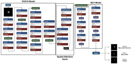 Our model combined a fine-tuned VGG16 model with MLP. For feature extraction from input images, an ImageNet-pre-trained VGG16 model was performed. All layers in the base model were frozen except for the last 3 layers. This means that the weights of most layers in the base model were not be updated during training. The VGG16 model consists of five blocks of convolutional layers with small 3 × 3 filters, each followed by a max-pooling layer to reduce the spatial dimension. A spatial attention mechanism was implemented to enhance the model’s ability to focus on relevant features. This was achieved using two successive DepthwiseConv2D layers with 7 × 7 and 5 × 5 kernels, capturing multiscale spatial information while significantly reducing the number of parameters and computational cost. These layers were followed by two standard Conv2D layers with ReLU and Sigmoid activation functions, respectively. ReLU was used after the first Conv2D layer to introduce non-linearity while preserving and propagating important spatial features, while Sigmoid activation was applied after the second Conv2D layer to generate attention weights between 0 and 1. This combination enables the model to extract meaningful spatial features and create a normalized attention map that determines which spatial regions to emphasize or suppress when multiplied by the original features. Then, a GlobalAveragePooling2D layer was used to reduce the spatial dimensions of the feature maps into a single vector, which served as input for the MLP. The MLP architecture used for the classification task included five dense layers integrated with dropout for regularization, which formed the network’s latter part, with a final dense layer producing a 3-unit output. The architecture of our model VGG16-MLP is presented in Figure 2.