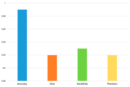 Bar charts of accuracy, dice coefficient, sensitivity, and precision of segmentation of the region of interest.