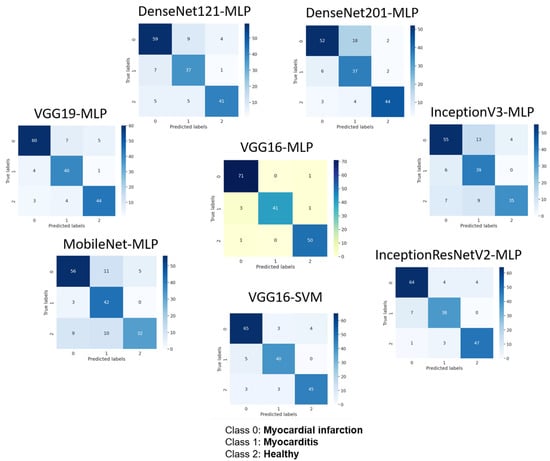 Confusion matrices of VGG16-MLP, VGG19-MLP, DenseNet121-MLP, DenseNet201-MLP, MobileNet-MLP, InceptionV3-MLP, InceptionResNetV2-MLP, and VGG16-SVM.