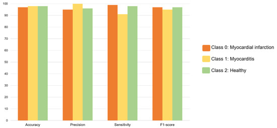 Bar charts of VGG16-MLP model’s accuracy, precision, sensitivity, and F1-score for myocardial infarction (class 0), myocarditis (class 1), and healthy (class 2). For the myocardial infarction, myocarditis, and healthy classes, the accuracy was 97%, 98%, and 98%; the precision was 95%, 100%, and 96%; the sensitivity was 99%, 91%, and 98%; and the F1-score was 97%, 95%, and 97%, respectively.