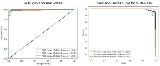 A confusion matrix was used to represent the performance of the tested models. To illustrate the performance of the three classes on the VGG16-MLP model, the receiver operating characteristic (ROC) curve, representing the true-positive rate as a function of the false-positive rate, and the precision–recall curve were employed.