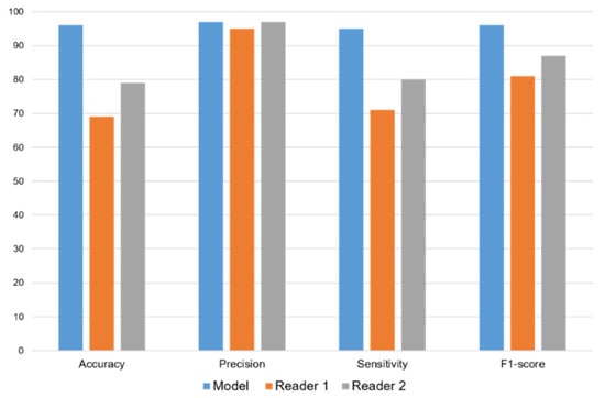 The first reader achieved an accuracy of 69%, precision of 95%, sensitivity of 71%, and F1-score of 81%. The second reader’s performance metrics were as follows: 79% accuracy, 97% precision, 80% sensitivity, and 87% F1-score. (Figure 8).