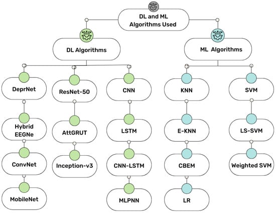 The diversity of DL and ML algorithms used in prior studies for EEG-based depression detection.