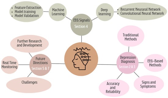 The survey is organized as follows. Section 2 describes the methodology for detecting depression. Section 3 details the five significant steps of the depression diagnosis pipeline. Section 4 reviews the literature based on the ML and DL approaches. Section 5 illustrates the discussion and comparison analysis. Section 6 explains the EEG datasets employed for diagnosing or predicting the treatment outcomes of depression. Section 7 discusses the prospective directions for this research. Lastly, in Section 8, we present the conclusion of the study. The entity relationship between the sections is illustrated in Figure 2.