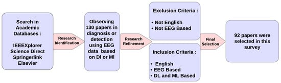 First, a search was conducted using carefully chosen keywords. After performing a preliminary search, additional words discovered in pertinent articles were added to the list of keywords. The most relevant key phrases from many research papers were chosen as initial keywords, such as “depression detection”, “depression diagnosis”, “MDD diagnosis”, and “mental illness disorders”. Other keywords, such as “EEG-based classification of depression”, “machine learning depression detection”, “EEG data depression detection”, and “deep learning depression diagnosis”, were chosen based on our understanding of the topic.