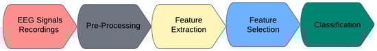 In recent studies [,,,,], EEG data have been investigated as a suitable diagnostic method for the detection of the neurological disorder. This is non-invasive and less expensive than other methods. With a time reference, EEG signals record data about the brain’s central nervous system and brain activities []. Postsynaptic potentials in cerebral cortical neurons comprise the EEG, the total of these potentials []. The technology for EEG acquisition offers non-camouflage and real-time differences. Commonly, it is employed to assess the functional state of the brain in a clinical context. A sensor can gather the EEG voltage produced in the brain through cortical conduction.