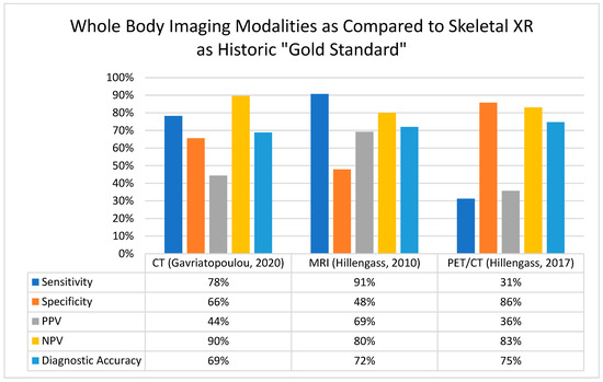 Over the past 20 years, the field of myeloma has witnessed significant improvements not only in survival rates due to more effective therapies, but also in the development of advanced diagnostic tools. Figure 1 summarizes the comparisons of sensitivity, specific, positive predictive value, negative predictive value, and overall diagnostic accuracy between whole-body CT, MRI, and PET/CT, compared to the historic standard of care, the X-ray. These advancements have facilitated the earlier identification of patients at high risk of disease progression and improved prognostication, allowing for more adequate monitoring for those in need, as suggested by Table 2.