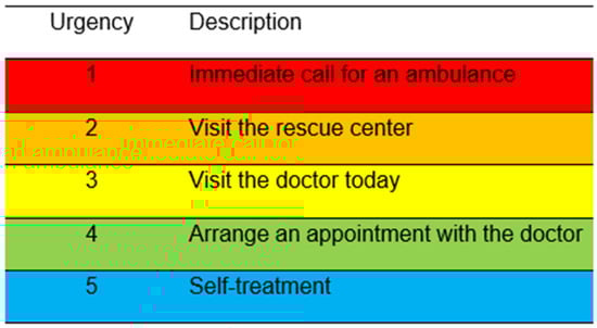 The diagnosis and urgency recommendation of the case vignettes set during creation by an independent specialist was defined as the gold standard. For the diagnoses, single points were awarded for the answers (correct diagnosis = 1 point; incorrect diagnosis = 0 points). Three suggestions per case and doctor were allowed. In the evaluation made by the apps, only the first three diagnoses were included if more were provided (D1, D2, D3). Points were also awarded based on the number of attempts required to reach the correct diagnosis (1 attempt = 3 points, 2 attempts = 2 points, 3 attempts = 1 point). No points were scored if the correct diagnosis was not made even after 3 attempts. The urgency recommendations by the experts and as far as given by the single apps were staged according to the classification table depicted in Figure 1.