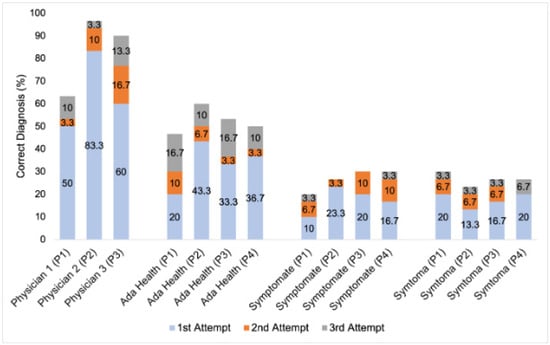 Percentage of correct diagnosis via doctors (n = 2) and symptom checker apps (n = 3).