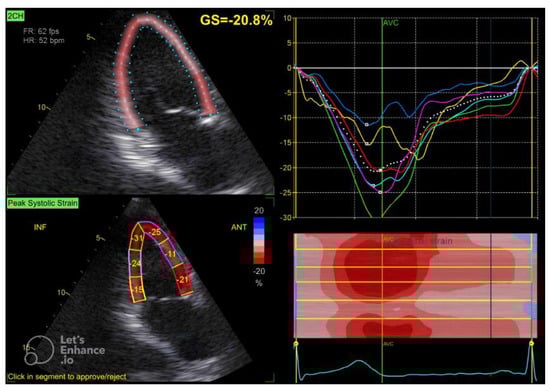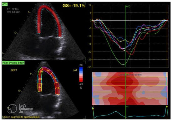 - Potter, E.L.; Wright, L.; Yang, H.; Marwick, T.H. Normal Range of Global Longitudinal Strain in the Elderly: The Impact of Subclinical Disease. JACC Cardiovasc. Imaging 2021, 14, 300–302. [Google Scholar] [CrossRef] [PubMed]