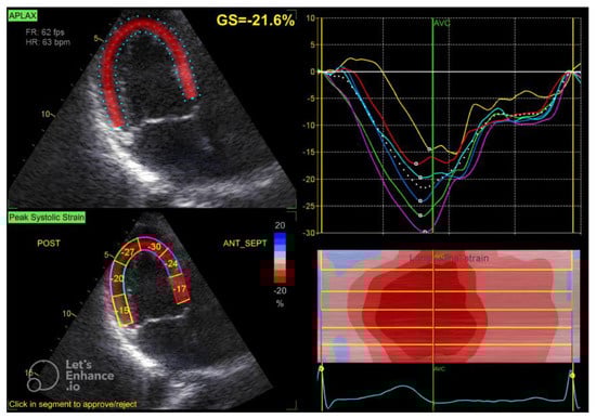 Recently, cardiac strain indices have been utilized to identify impairments in cardiac function early on, even prior to the onset of LV hypertrophy. Numerous studies indicate that speckle tracking echocardiography can detect slight heart function impairments in cases of minor myocardial dysfunction, even in the absence of structural changes in the heart [8,9]. Furthermore, speckle tracking echocardiography assesses both systolic and diastolic functions while also evaluating myocardial fibrosis, aiding in differentiating between hypertensive-induced left ventricular hypertrophy and that resulting from other etiologies [10]. Additionally, this technique allows for the evaluation of heart function from various perspectives, irrespective of imaging angles [11,12].