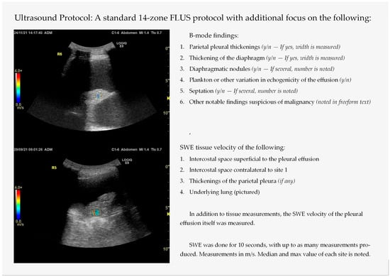 The included patients were subjected to an ultrasound examination in accordance with the 14-zone focused lung ultrasound (FLUS) protocol [18], in which 14 thoracic sites are scanned, with 2 anterior, 2 lateral and 3 posterior sites bilaterally (Figure A1). In addition to the standard examination foci of the FLUS regarding interstitial syndrome, pneumothorax and pleural effusion, septation, plankton, thickening of the pleurae and the diaphragm was noted, as well as diaphragmatic nodules. Additional B-mode findings were noted, such as descriptions of consolidations inferior to the effusion. The patients were then subjected to shear wave elastography (SWE) and tissue velocity measurement of the pleural effusion, the underlying lung tissue, the intercostal space superficial of the pleural effusion and the corresponding intercostal space on the opposite site of the thorax. If pleural thickenings were found, elastography was performed on these as well.