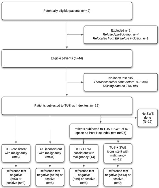 A total of 49 patients were screened for inclusion during the study period (Figure 2). In total, 39 patients were included in the final study. Of the included patients, 33 were subject to SWE analysis, and, of these, 27 SWE scans of the intercostal space yielded results for post hoc analysis for an SWE-based index test (the highest of any SWE scan site).