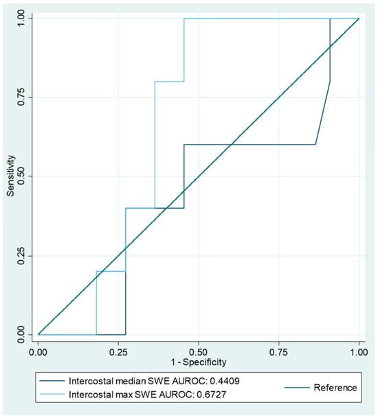 AUROC curve analysis of intercostal-space SWE. AUROC = area under receiver operating characteristic, SWE = shear wave elastography.