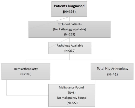 - Davis, J.A.; Rohlfing, G.; Sagouspe, K.; Brambila, M. Assessing the Value of Routine Pathologic Examination of Resected Femoral Head Specimens After Femoral Neck Fracture. J. Am. Acad. Orthop. Surg. 2019, 27, e664–e668. [Google Scholar] [CrossRef]