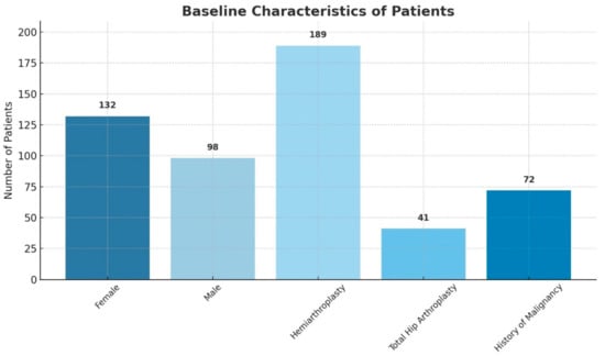 The mean age of the 230 patients in the cohort was 82.4 ± 14.1 years; 132 (57%) were women. A total of 41 (18%) underwent total hip arthroplasty and 189 (82%) underwent partial hip arthroplasty. For 72 (31%) patients, their medical history included past or active malignancy at the time of the operation (Figure 2).