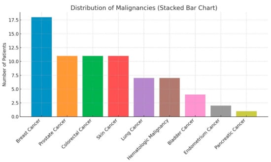Figure 3 shows that breast cancer was the most common malignancy, accounting for 25% of cases (18 patients). Prostate, colorectal, and skin cancers each contributed 15% (11 patients). Lung cancer and hematologic malignancies comprised 10% of cases (7 patients each), while bladder cancer represented 5% (4 patients). Less common malignancies included endometrial cancer (3%, 2 patients) and pancreatic cancer (1%, 1 patient).