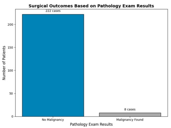 Of the 230 patients included in the study, 8 (3.4%) were found to have malignancies identified through femoral head pathology examination, while 222 (96.6%) showed no evidence of malignancy (Figure 4).