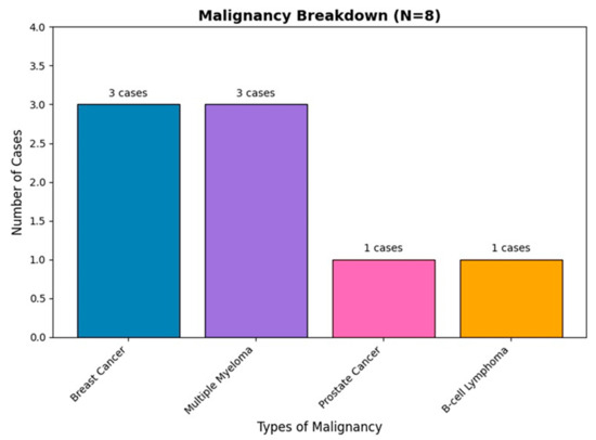 All 8 patients with malignancies had current, active cancer at the time of the fracture and operation. The most common malignancies identified were breast cancer and multiple myeloma, each found in three patients (38%), while prostate cancer and B-cell lymphoma were identified in one patient each (Figure 5).