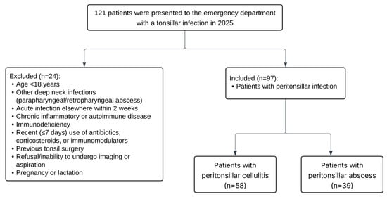 The research was a prospective cohort study conducted at a single center. This study was conducted on patients who presented to the emergency department of our tertiary training and research hospital and were followed up and treated in the otorhinolaryngology department with a diagnosis of peritonsillar infection between February 2025 and July 2025. A total of 97 patients were included in the study (PTA: n = 39; PTC: n = 58). The control group consisted of 60 healthy volunteers without chronic comorbidities, recent infections, or use of systemic antibiotics, corticosteroids, or immunomodulatory drugs. All control subjects were confirmed to be free of recent infections or inflammatory conditions based on the absence of clinical symptoms and normal laboratory parameters, including leukocyte, neutrophil, lymphocyte counts, and CRP levels. Demographic data were collected from all participants. Exclusion criteria included patients younger than 18 years; those with other deep neck space infections such as parapharyngeal or retropharyngeal abscess; concurrent acute bacterial or viral infections at another site within the previous two weeks; any chronic inflammatory disease and autoimmune disorders; immunodeficiency; receipt of systemic antibiotics, corticosteroids, or immunomodulatory drugs within seven days prior to blood sampling; prior head and neck surgery involving the tonsillar region; inability or refusal to undergo imaging or aspiration; and pregnancy or lactation (Figure 1).