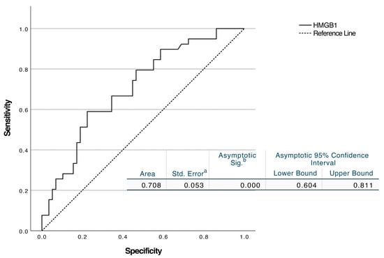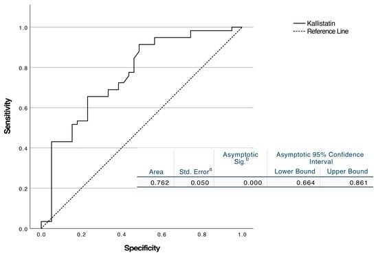ROC curve analysis revealed that HMGB1 had an AUC of 0.708 (95% CI, 0.604–0.811; p < 0.001). A cut-off of ≥18.79 ng/mL resulted in 66.7% sensitivity (95% CI: 51–79.4%) and 65.5% specificity (95% CI: 52.7–76.4%) (Figure 2). Kallistatin had an AUC of 0.762 (95% CI 0.664–0.861; p < 0.001). The threshold of ≤2.61 ng/mL showed 72.4% sensitivity (95% CI: 59.8–82.2%) and 61.5% specificity (95% CI: 45.9–75.1%) (Figure 3).