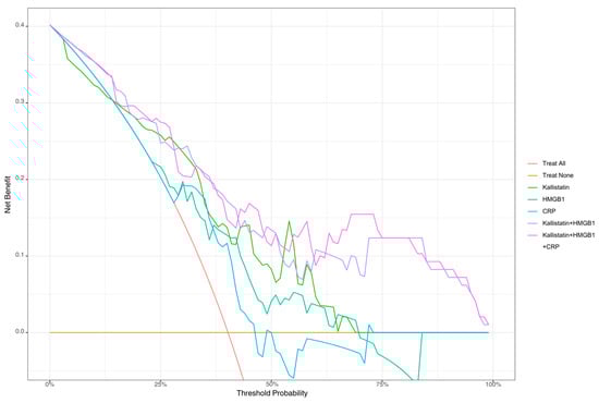Decision curve analysis demonstrated that all models achieved a maximum net benefit of 0.402 at a threshold probability 0% (treat all strategy). However, the three-biomarker combination model showed the highest mean net benefit (0.183) across all threshold probabilities (Table 6). The two-biomarker combination achieved a mean net benefit of 0.176, while individual biomarkers showed lower values (kallistatin: 0.131, HMGB-1: 0.111, CRP: 0.099). At clinically relevant threshold probabilities, the three-biomarker combination maintained the highest net benefit at a 25% threshold (0.275), while demonstrating sustained clinical utility at 50% (0.113) and 75% (0.124) thresholds. In contrast, individual biomarkers showed diminishing or negative net benefit at higher thresholds, with HMGB-1 showing negative net benefit (−0.031) at 75% threshold probability (Figure 4).