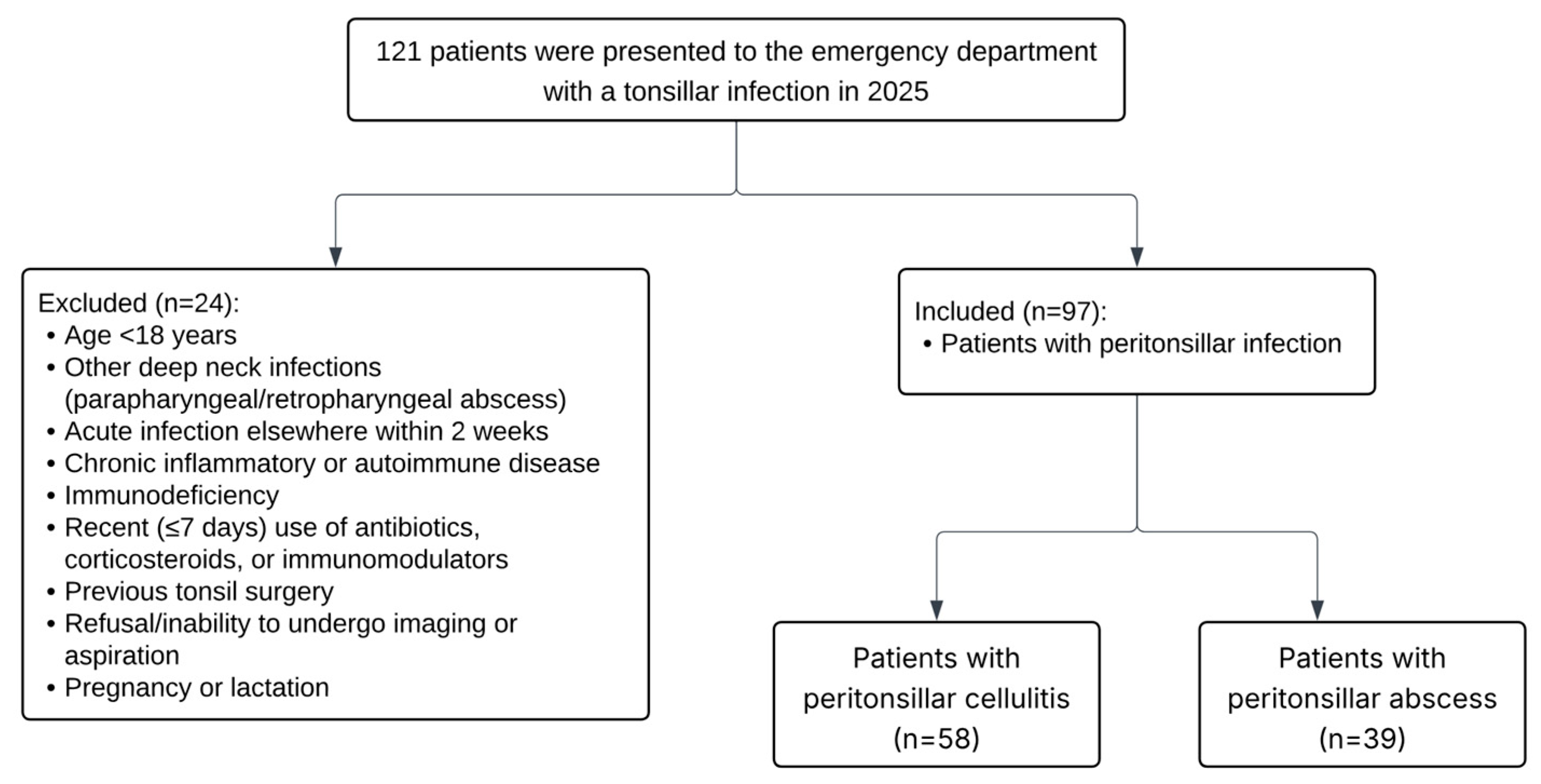 - Voruz, F.; Revol, R.; Combescure, C.; Monnier, Y.; Becker, M.; Dulguerov, N. Diagnosis of Peritonsillar Abscess—A Prospective Study Comparing Clinical with CT Findings in 133 Consecutive Patients. Diagnostics 2025, 15, 228. [Google Scholar] [CrossRef]