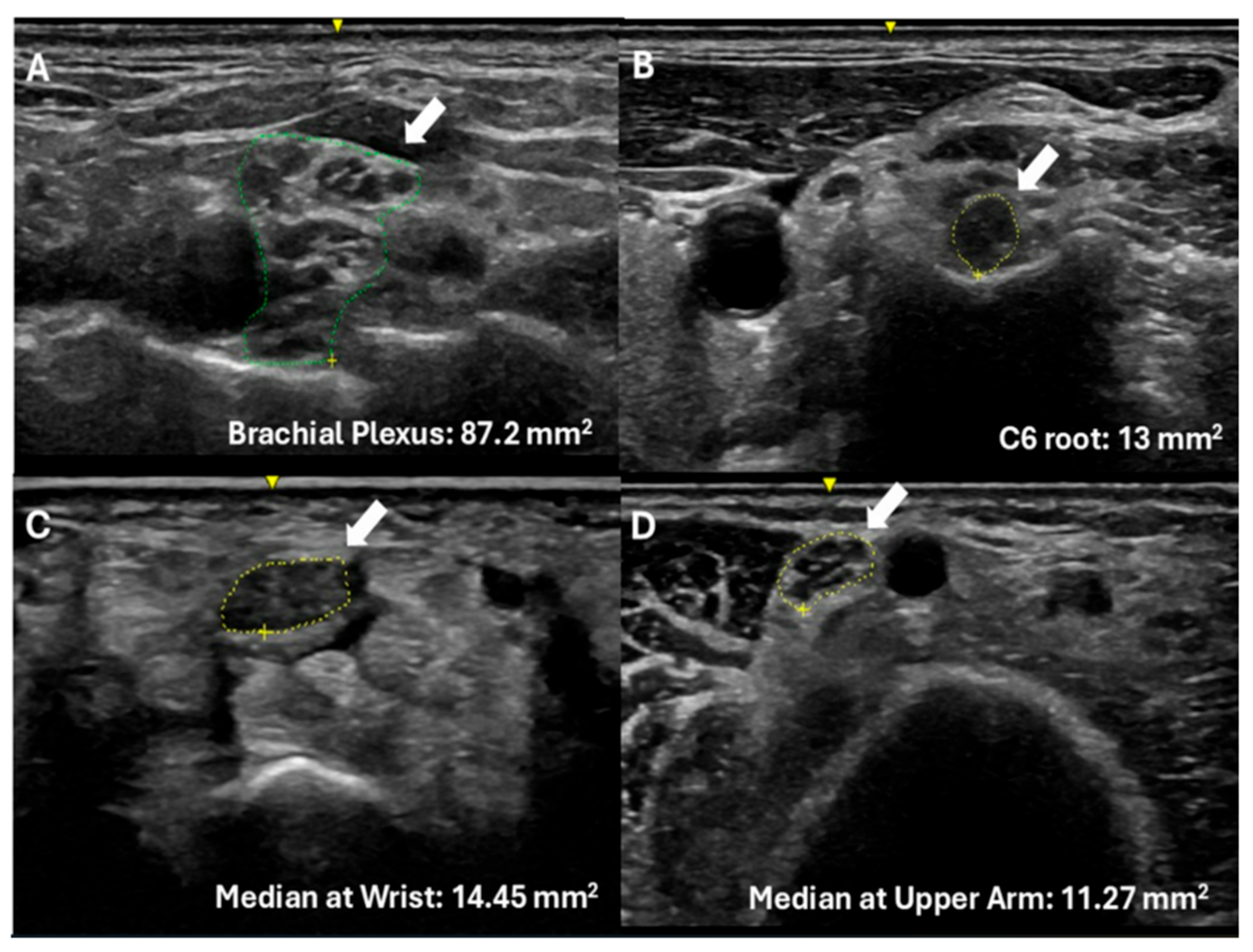 - Fisse, A.L.; Katsanos, A.H.; Gold, R.; Pitarokoili, K.; Krogias, C. Cross-sectional Area Reference Values for Peripheral Nerve Ultrasound in Adults: A Systematic Review and Meta-analysis—Part I: Upper Extremity Nerves. Eur. J. Neurol. 2021, 28, 1684–1691. [Google Scholar] [CrossRef]