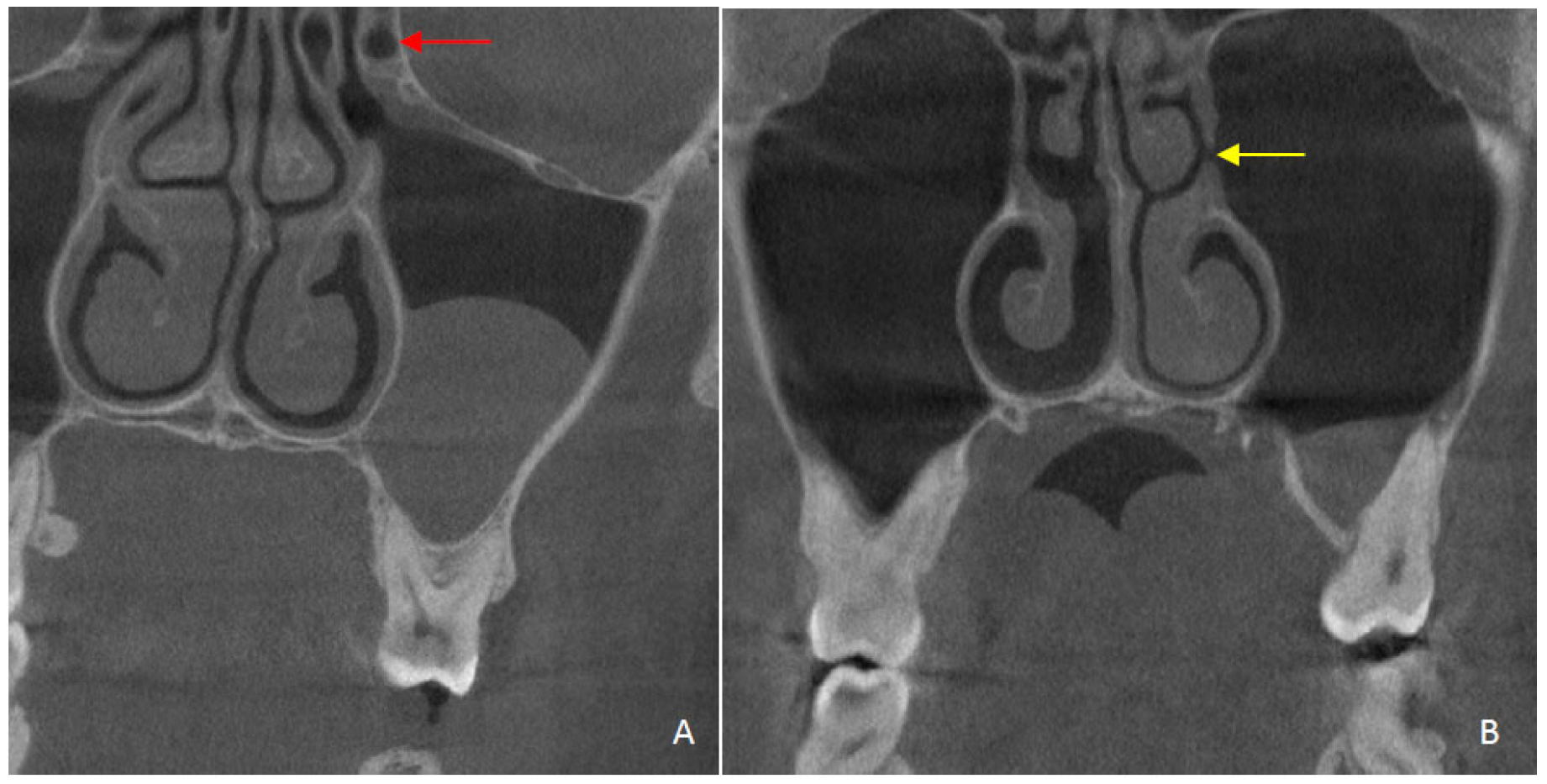 - Asantoğrol, F.; Coşgunarslan, A.; Soydan Çabuk, D.; Amuk, M. The prevalence of Haller cell and its effect on maxillary sinusitis and obstruction of osteomeatal complex. Turk. Klin. J. Dent. Sci. 2021, 27, 191–198. [Google Scholar] [CrossRef]