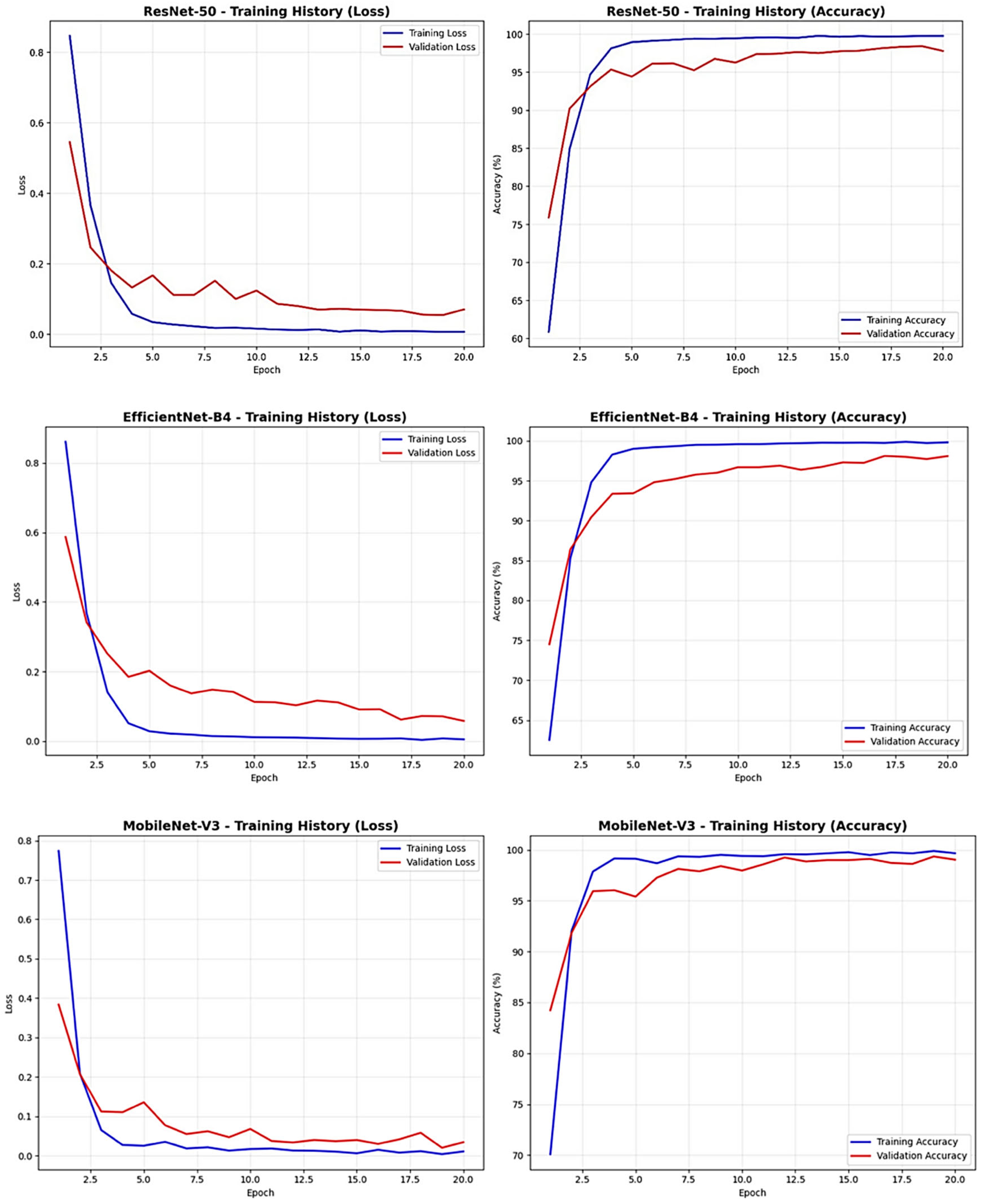 Figure 1). EfficientNet-B4 demonstrated robust training characteristics with systematic convergence patterns, showing training loss decreasing from approximately 0.9 at epoch 1 to below 0.1 by epoch 20, while validation loss decreased from approximately 0.6 to around 0.1. The accuracy progression revealed training accuracy improving from approximately 62% at epoch 1 to nearly 100% by epoch 20, with validation accuracy starting at approximately 74% and reaching 98% at the final epoch. The parallel trajectory of training and validation metrics indicated successful optimization without overfitting concerns, with consistent convergence throughout the complete training duration.