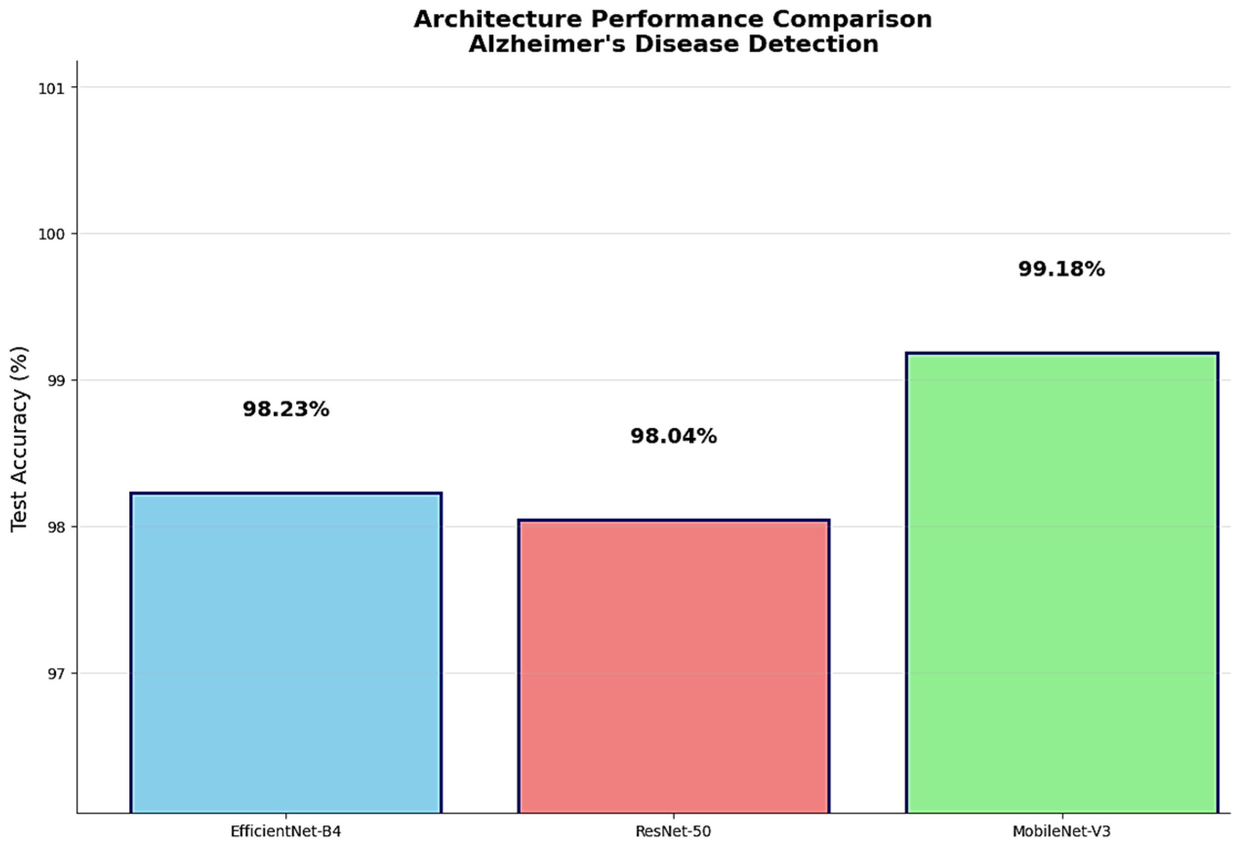 The comprehensive performance comparison revealed MobileNet-V3 as the superior architecture with the highest test accuracy of 99.18%, representing meaningful improvements over EfficientNet-B4’s 98.23% accuracy and ResNet-50’s 98.04% accuracy (