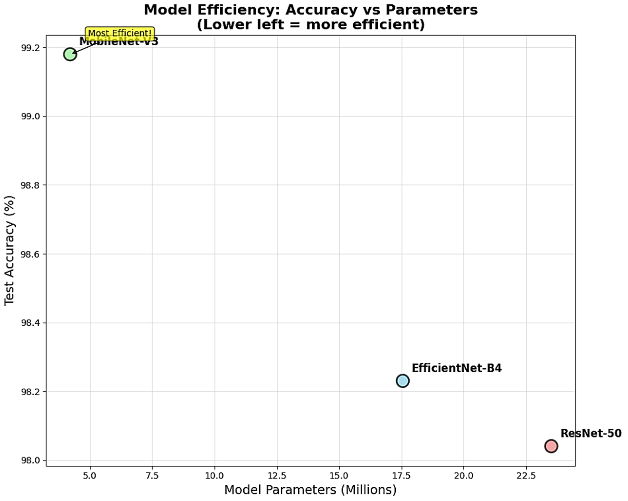 Figure 3). MobileNet-V3 achieved the highest classification accuracy using only 4,207,156 parameters, representing 82% fewer parameters than ResNet-50’s 23,516,228 parameters and 76% fewer parameters than EfficientNet-B4’s 17,555,788 parameters. This efficiency advantage translates directly to reduced memory requirements, faster inference times, lower power consumption, and decreased deployment costs for clinical implementation. The superior parameter-to-performance ratio demonstrated MobileNet-V3’s architectural optimization for achieving maximum diagnostic accuracy with minimal computational overhead.