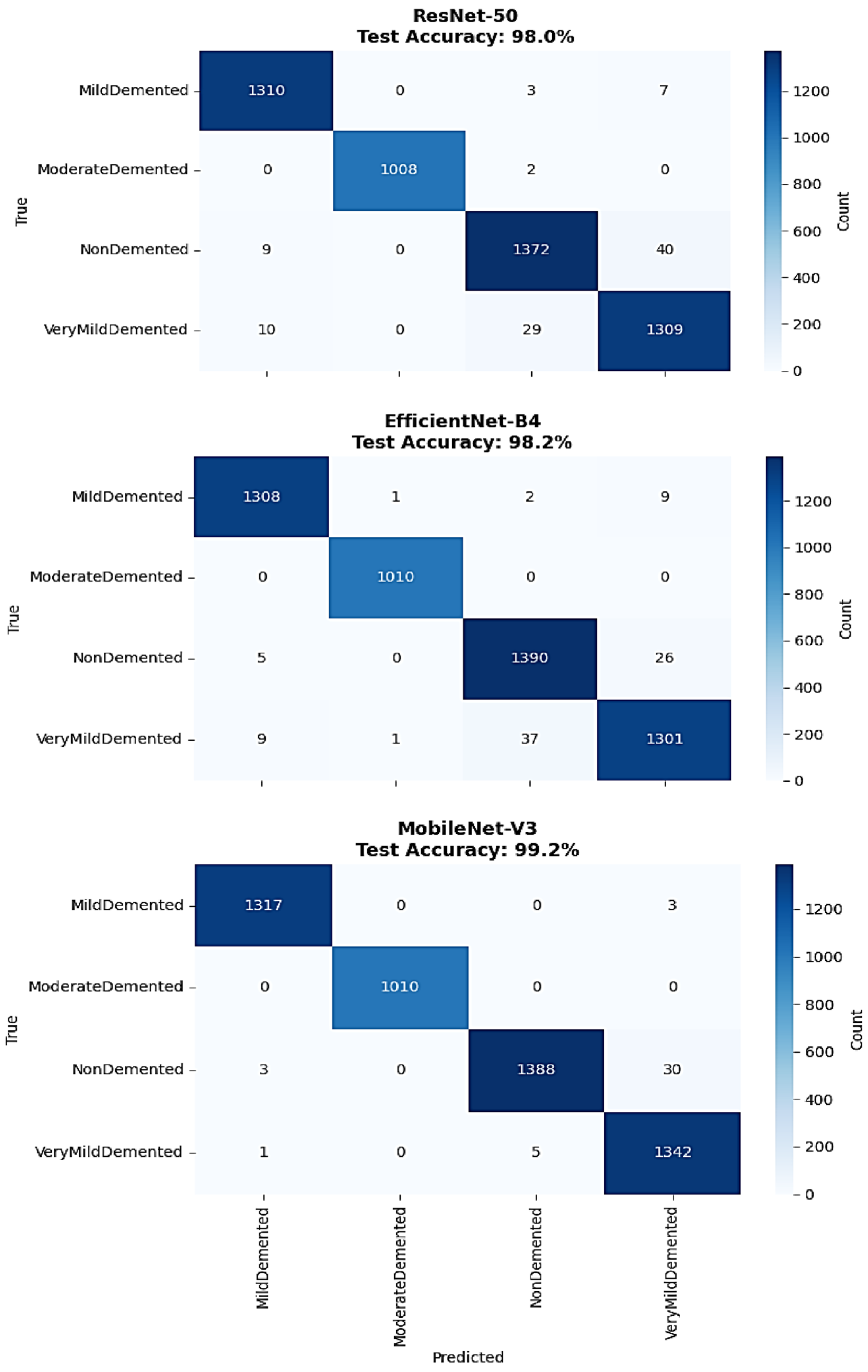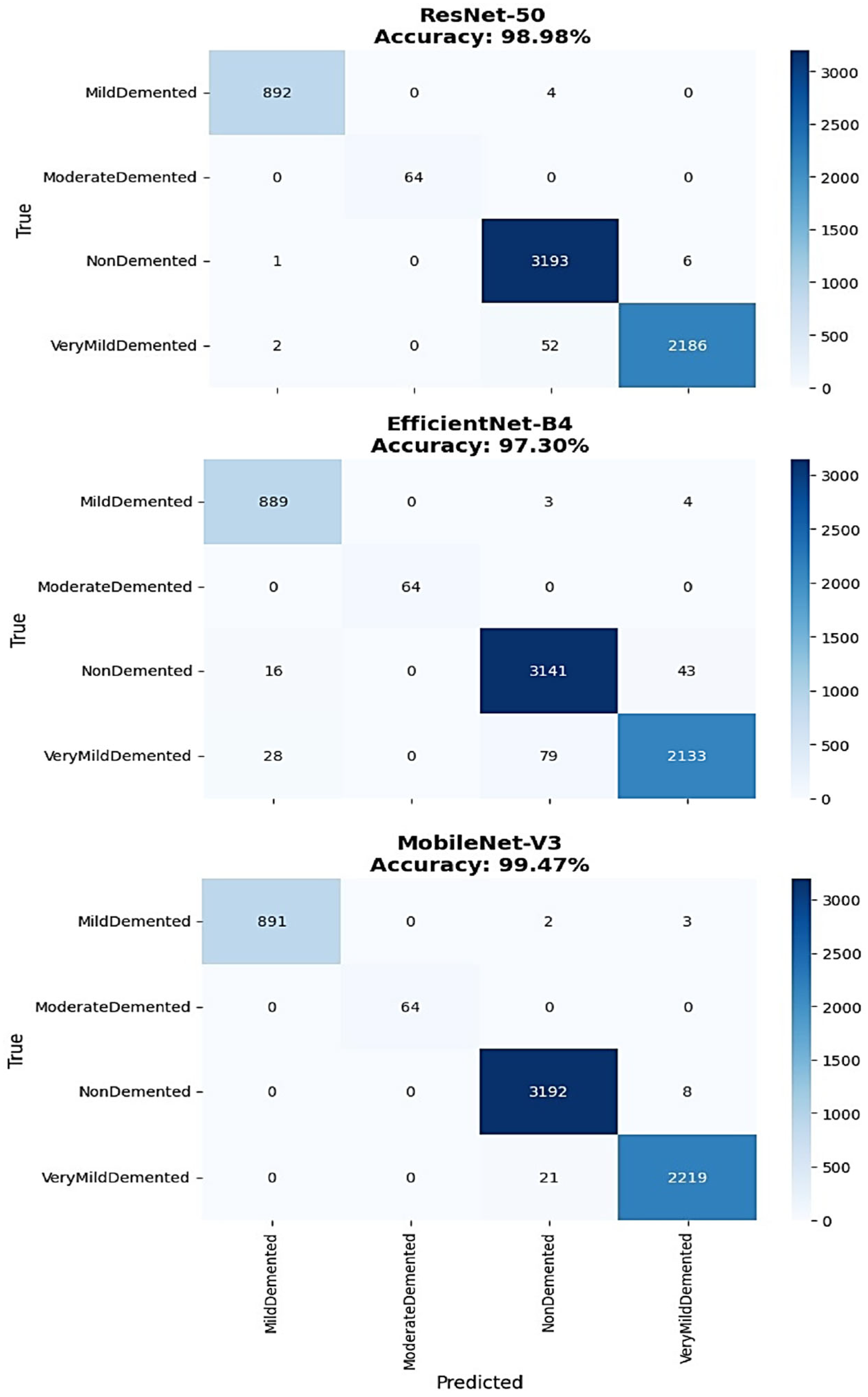 MobileNet-V3 demonstrated superior classification performance with 99.2% overall accuracy, achieving exceptional results across all categories. MildDemented classification reached 1317 correct predictions out of 1320 samples, while ModerateDemented maintained perfect classification with all 1010 samples correctly identified. NonDemented classification achieved 1388 correct predictions out of 1421 samples, and VeryMildDemented classification demonstrated 1342 correct predictions out of 1348 samples. The minimal misclassification errors included only 30 NonDemented cases misclassified as VeryMildDemented and 5 VeryMildDemented cases misclassified as NonDemented, representing the lowest error rates among all architectures. The performance criteria for all the classes of Alzheimer’s disease severity, particularly for the precision, recall, and F1-score of each individual class, were calculated from results derived using confusion matrices. Calculations were also based on detailed classification reports that relate to the EfficientNet-B4, ResNet-50, and MobileNet-V3 architectures (